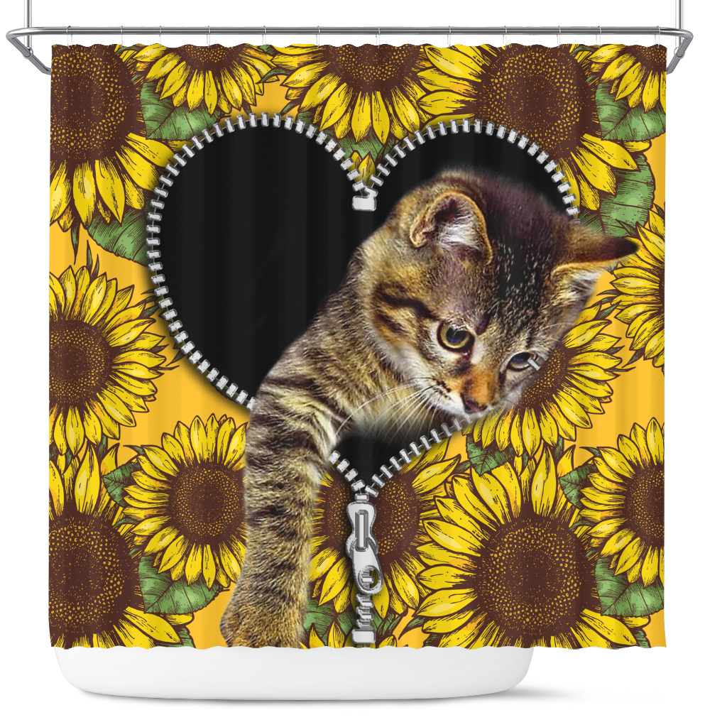 Cute Cat Sunflower Zipper Shower Curtain