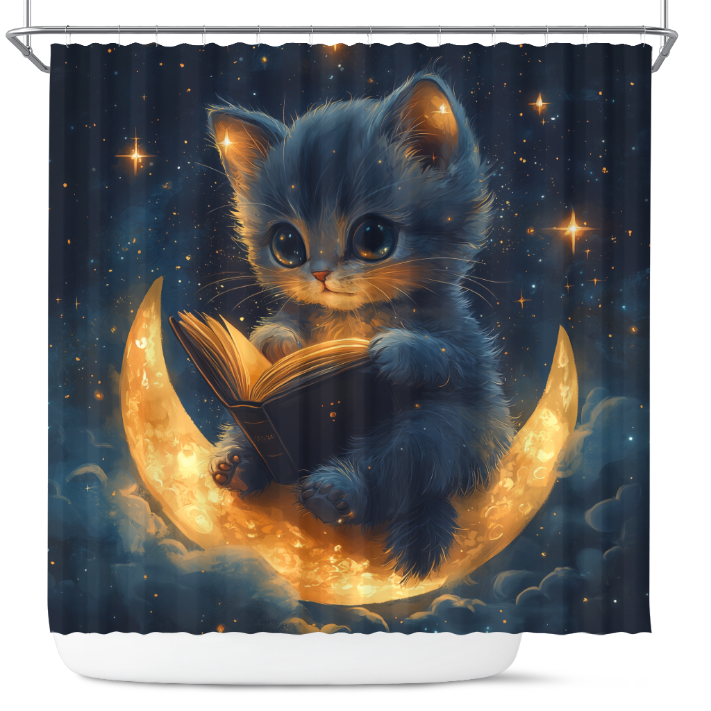 Cute Kitty Reading On A Crescent Moon Shower Curtain