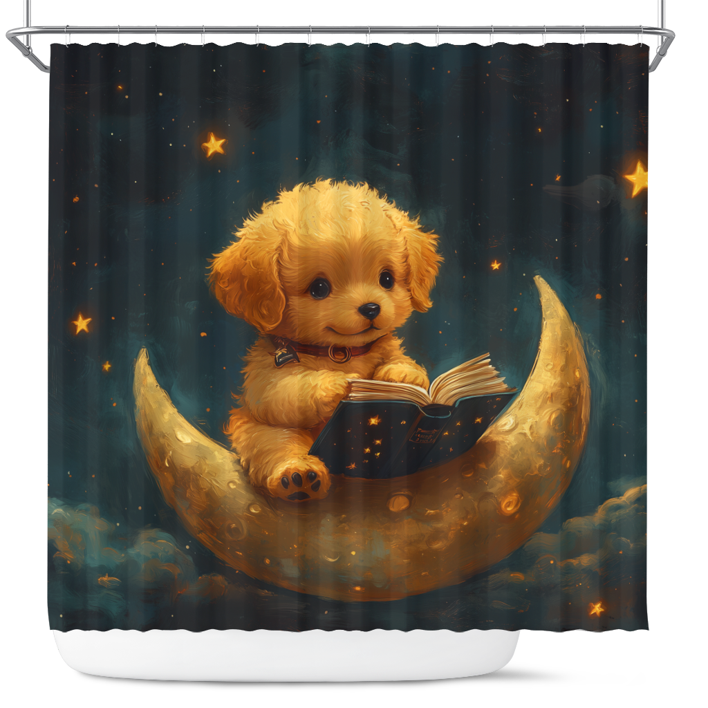 Cute Puppy Reading On A Crescent Moon Shower Curtain